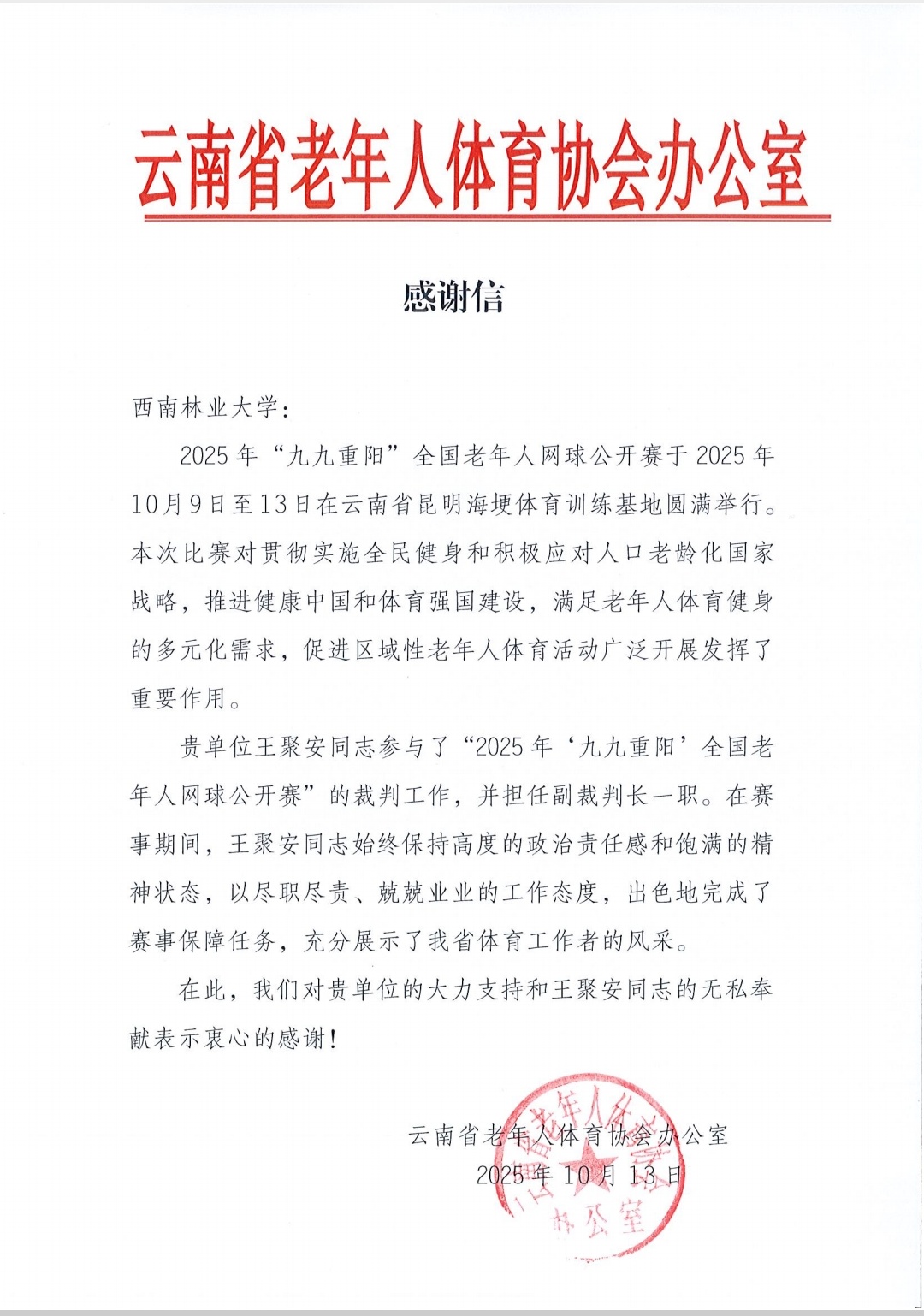 近日,云南省老年人体育协会向西南林业大学发来感谢信,对我校体育学院王聚安老师在2025年“九九重阳”全国老年人网球公开赛中的赛事保障工作表示衷心感谢并给予高度赞扬。