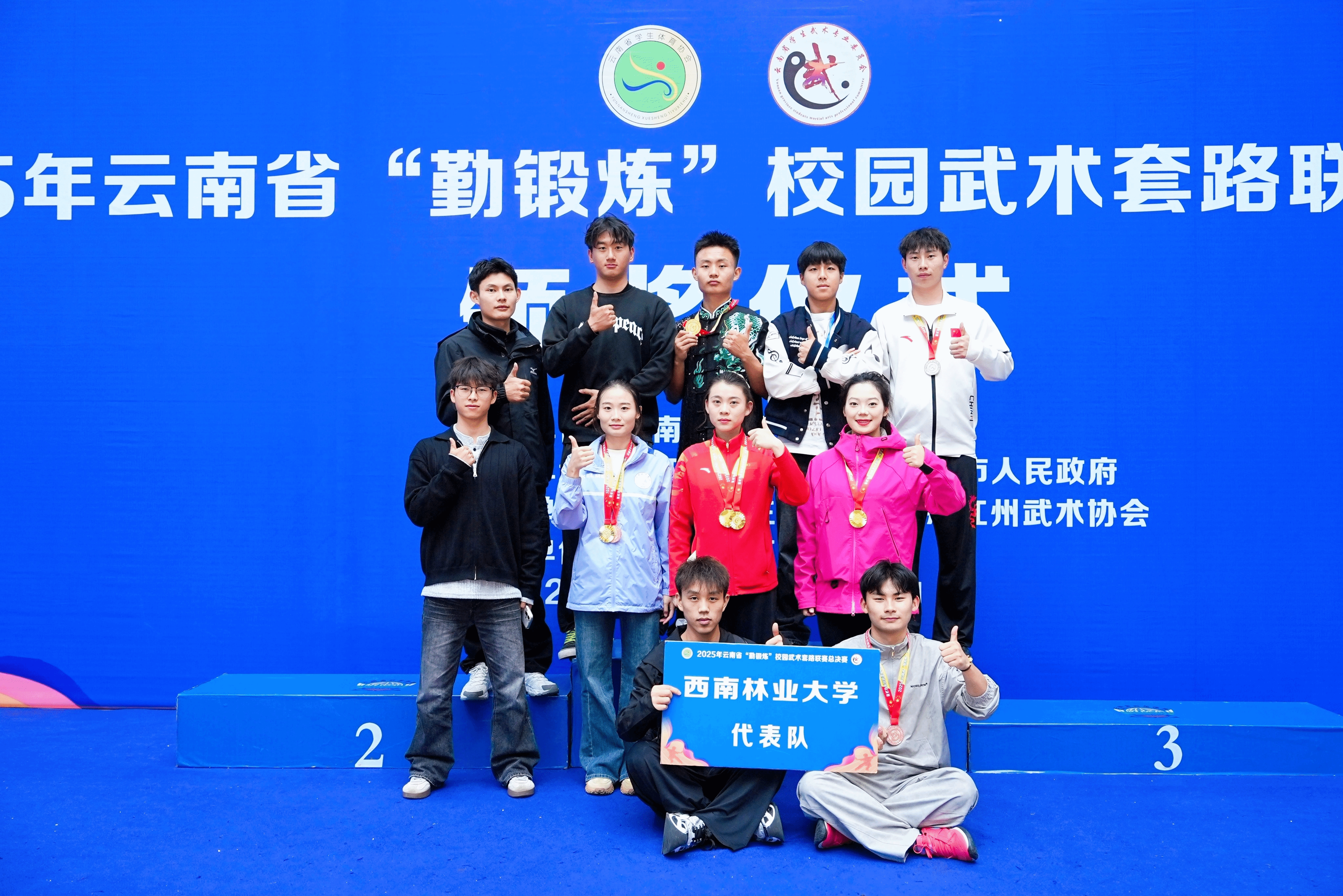 在体育学院段静老师的带领下,西南林业大学武术队共派出11名队员参赛。他们凭借扎实的基本功与稳定的赛场发挥,在激烈角逐中脱颖而出,最终斩获7金、2银、2铜的优异成绩,并取得1项第四名、4项第五名。